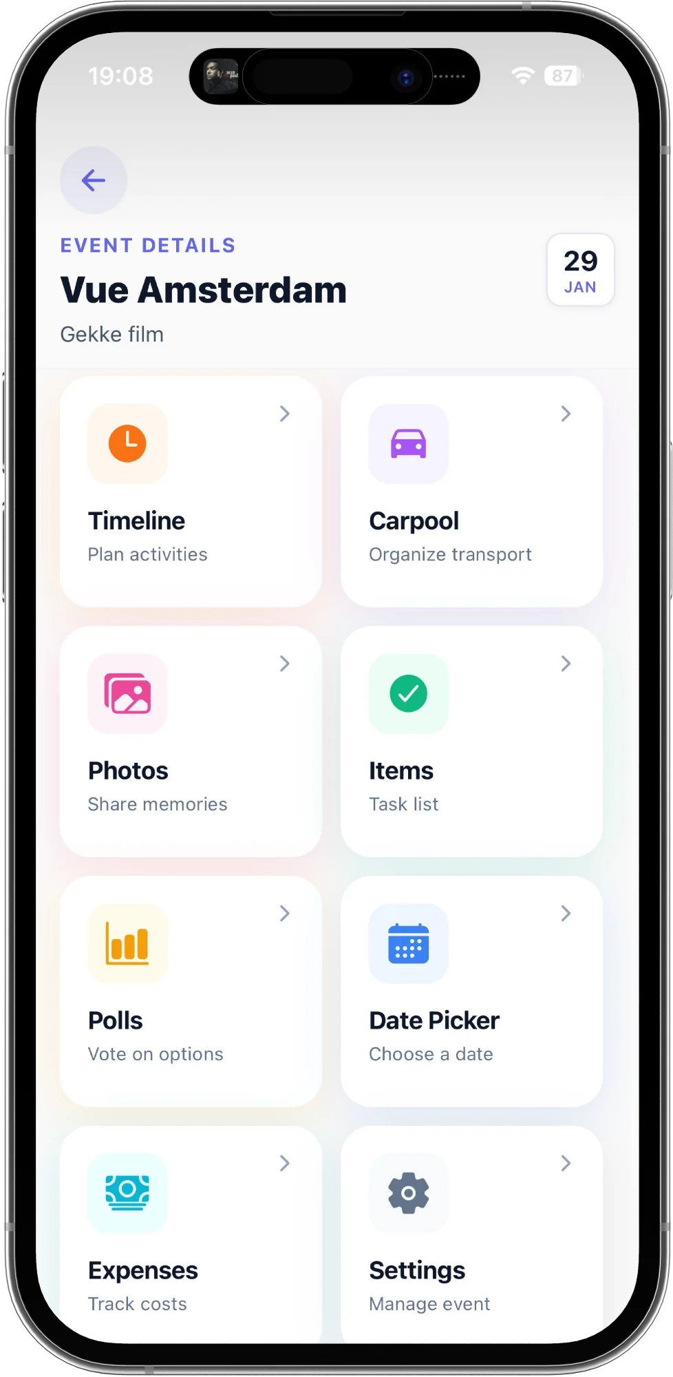De app voor groepsplannen. Datum prikken, carpool regelen, kosten splitsen en meer. Alles op één plek.